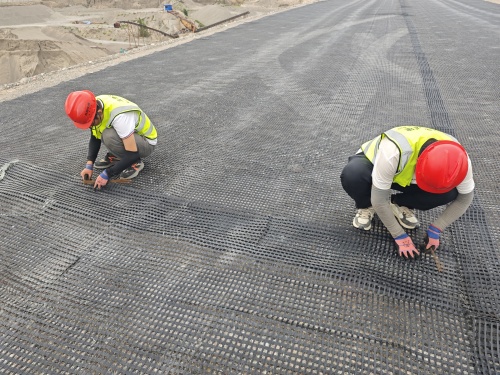 圖片新聞(鋪設(shè)土工格柵)2024-08-09圖為新疆兵團(tuán)建工水電集團(tuán)市政路橋公司第五師雙河市沙山子線公路互通立交工程,,段鋪設(shè)土工格柵。王小丫攝...