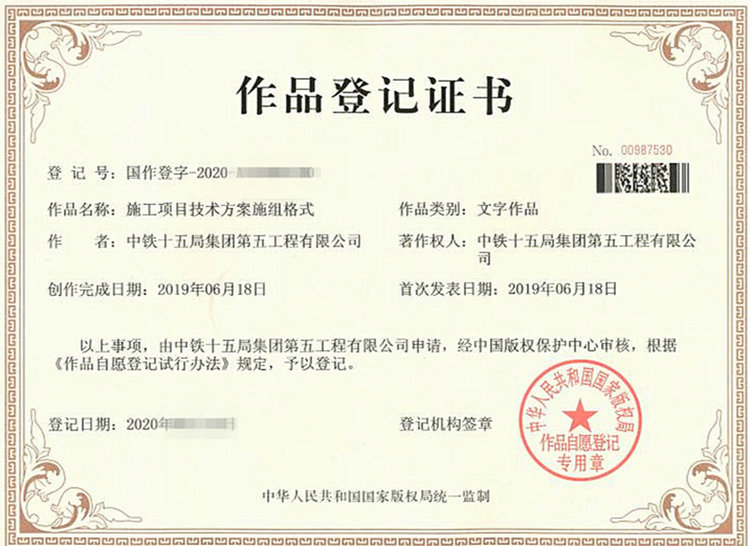 4月15日,中鐵十五局五公司喜獲中華人民共和國(guó)國(guó)家版權(quán)局頒發(fā)的《施工項(xiàng)目技術(shù)方案施組格式》作品登記證書,在著作權(quán)保護(hù)方面取得新進(jìn)展。