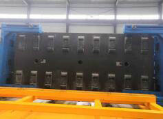 圖四:經(jīng)檢測強度滿足規(guī)范要求后,進行脫模作業(yè),實現(xiàn)了160個機械手同步對張拉桿進行模糊精確找準對位,并進行同步放張,放張的速率滿足規(guī)范要求。 圖五:運板小車平穩(wěn)將軌道板運輸至翻轉(zhuǎn)設備,通過油缸控制系統(tǒng),將軌道板抱死,可實現(xiàn)0至180度任意角度翻轉(zhuǎn)。圖六:對脫模工位進行了驗證,實現(xiàn)了模具精確定位,自動找準灌漿孔椎體,解除椎體與模板之間的鏈接,控制軌道板平衡、吊裝椎體順利實現(xiàn)了軌道板脫模。