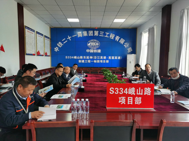 調(diào)研組觀看施工視頻及匯報材料 安徽省交通運輸廳綜合執(zhí)法局公路執(zhí)法處處長黃開元、省公路中心楊彥峰、省交通質(zhì)監(jiān)局水運監(jiān)督處丁濤出席調(diào)研會,蕪湖市交通運輸局黨委委員、副局長沈朝榴、公路管理局黨委書記、局長林春、黨委委員、副局長許帶兵、江南建設(shè)辦主任丁欣、相關(guān)科室負責人及S334峨山路項目部負責人出席此次調(diào)研活動。
