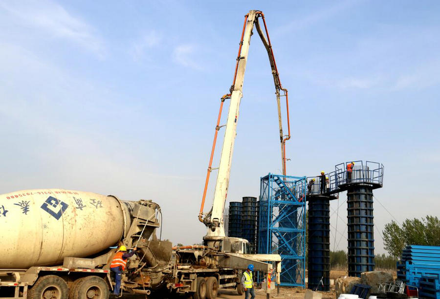京德高速項目首個圓柱墩位于文安北互通立交段右幅30號墩,共計3根圓柱墩,采用三柱同時施工方式,墩柱直徑1.4米,柱間距5.8米,墩高分別為6.74米、6.85米、6.97米?;炷翝仓绞狡嚤帽盟土先肽?,人工配合混凝土振搗。