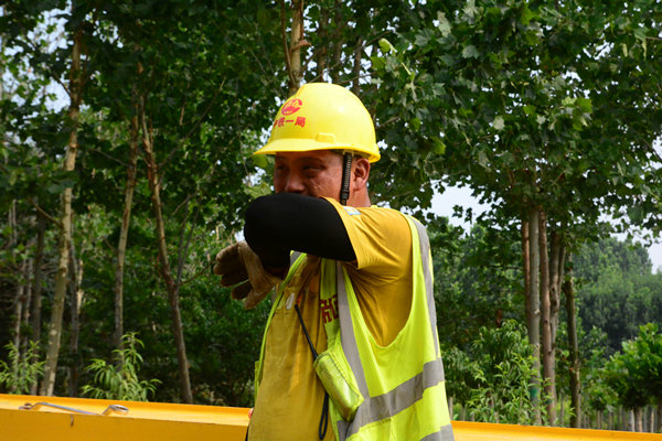上午7時許,設(shè)備拆解現(xiàn)場總指揮柴兵一聲令下,兩臺大噸位吊車緩緩起鉤,提梁機(jī)主體拆解工作正式拉開序幕。安全員全程盯控,現(xiàn)場指揮與吊車司機(jī)緊密配合,一個小時后1號提梁機(jī)機(jī)臂成功落地。隨后,工作人員頭頂烈日,開始剛?cè)嵬鹊牟鸾夤ぷ?。來自陜西的年輕工友雷人龍抹了把臉上的汗,瞇著眼睛笑著說道,今天要拆上百條螺栓,手上若不戴上工作手套,掌心就會磨脫皮,兩三個小時就要磨爛一雙新手套。渴了,工人們會到旁邊歇幾分鐘,500毫升一瓶的礦泉水,咕咚咕咚兩口就沒了。