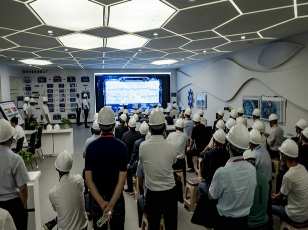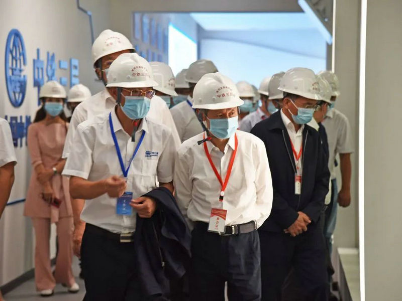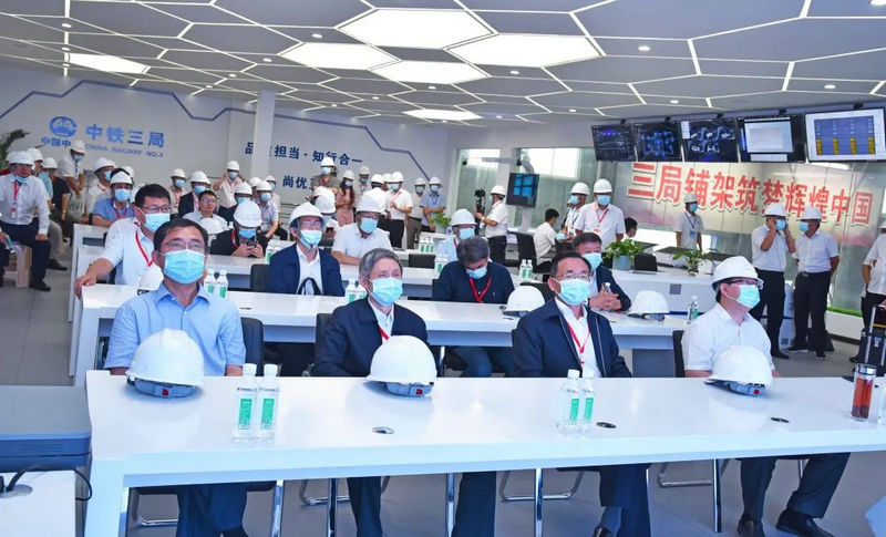 中國中鐵總工程師孔遁(左二)、中國中鐵高級專家朱本珍(左一)、中鐵三局總經(jīng)理李新遠(左三)在智控中心