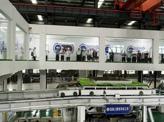 觀摩團一行人觀光通道參觀車間自動化軌枕生產(chǎn)線
