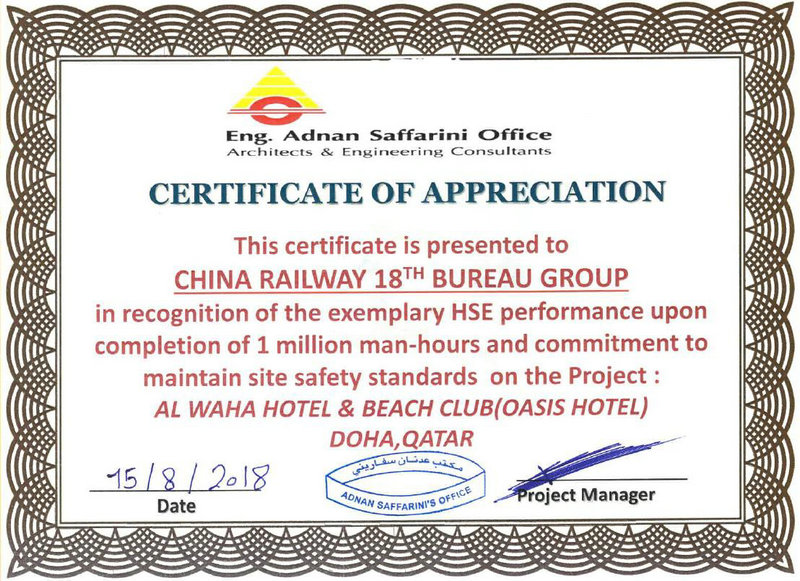 本站天津訊(孫太東 劉曉東 姜凡菲)近日,中鐵十八局集團(tuán)國(guó)際公司卡塔爾綠洲酒店項(xiàng)目累計(jì)百萬(wàn)工時(shí)無(wú)事故,獲得監(jiān)理單位頒發(fā)的“百萬(wàn)工時(shí)零事故”的安全生產(chǎn)獎(jiǎng)狀。