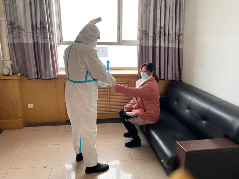 圖為防疫人員為發(fā)熱人員測(cè)溫