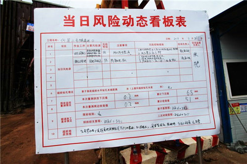 在中鐵二十一局集團興泉鐵路XQXN-1標六公司項目二分部承建的何屋2#隧道進口洞門右側(cè),赫然矗立著這樣一個清晰醒目的看板;其中8月26日的一條警示說:作業(yè)工序:明洞施工;主要風險源:未按規(guī)定佩戴安全防護用品、臨邊防護不到位;風險等級:低;注意事項:防止高空墜落;風險控制措施:一是進入現(xiàn)場作業(yè)人員必須佩戴安全防護用品;二是設立警示標識牌;超前地質(zhì)預報:當前掌子面開展超前地質(zhì)預報有TSPC(地震波),加深炮孔,圍巖等級Va,較破碎,與設計相符,無異常。圍巖級別:Va,掌子面里程:DIK16+305:并明確公示現(xiàn)場負責人和現(xiàn)場監(jiān)理負責人。