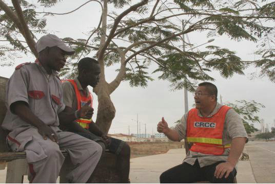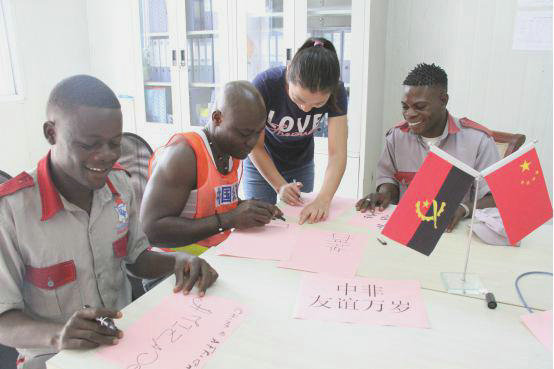 會(huì)后,在安員工還與安籍工人分組進(jìn)行了討論和交流,并用葡語(yǔ)(當(dāng)?shù)毓俜秸Z(yǔ)言)翻譯“中非友誼萬(wàn)歲”。