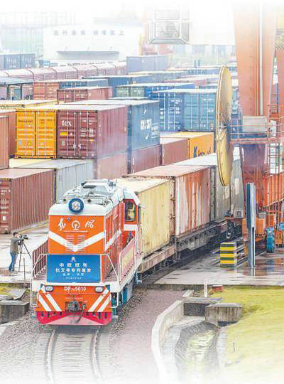 11月22日,X9216/5次“杭叉號”中歐班列從浙江金華南站啟程,經(jīng)霍爾果斯出境,駛向哈薩克斯坦的梅杰烏。 胡肖飛攝(影像中國)