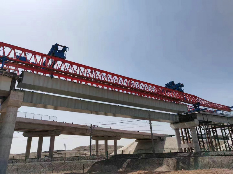 本次架梁施工采用QJ300-50 A3門式架橋機(jī),架橋機(jī)額定起重量300t,架梁跨度50m,為了保證架橋作業(yè)順利進(jìn)行,中鐵二十一局五公司七墩至瓜州公路上跨蘭新鐵路公鐵立交橋項(xiàng)目部認(rèn)真組織,加強(qiáng)人力、物資和機(jī)械等資源配置,分析各種風(fēng)險(xiǎn)源,制定相應(yīng)的應(yīng)急安全卡控措施。積極主動(dòng)與運(yùn)輸、設(shè)備和監(jiān)管部門通力合作,克服各種不利因素,嚴(yán)格按照封鎖計(jì)劃和施工方案有序組織施工,把施工對(duì)鐵路運(yùn)輸?shù)挠绊懡档搅俗畹停踩?、高效完成了跨鐵路架梁施工任務(wù)。