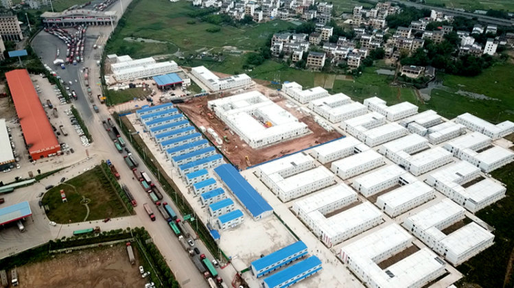 圖為援建方艙醫(yī)院員工爭分奪秒,使命必達