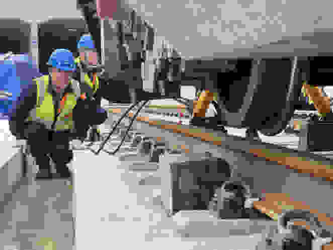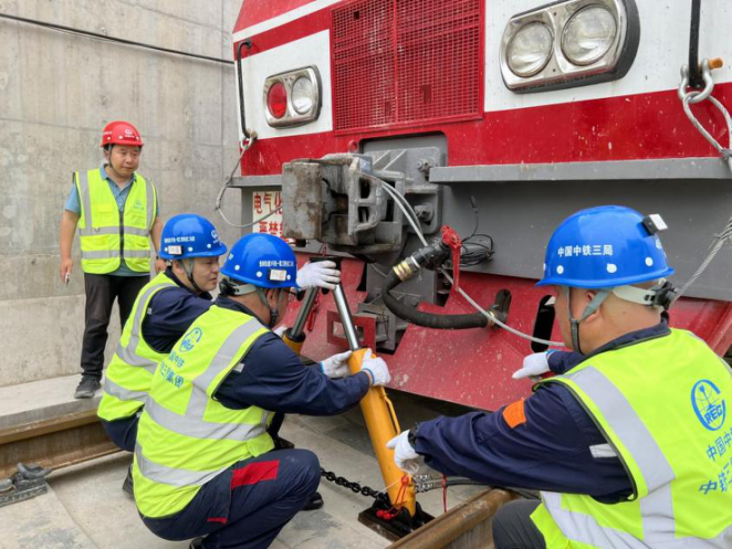 整個現(xiàn)場起復救援演練有條不紊的進行著,應急小組到達現(xiàn)場后第一時間在現(xiàn)場做好防護,將不起復一端的車輪用止輪器牢靠固定,起復一端的車輪減震簧中部的螺桿擰上墊圈和螺母,使車輪和車體牢靠固定,隨后在軌道車車鉤處安裝“弓”型頂托,接著將油缸、“鞍”型頂托和鏈條組裝成穩(wěn)定的三角形,操作油泵使油缸伸出并使車鉤向上頂實,此時開始進行整個流程里最關鍵的一環(huán),操作復軌器使其頂起車輛前端向上移動并橫移至適當?shù)乃礁叨?,緩慢降低,使輪對與鋼軌踏面完美咬合,最后有序的撤除現(xiàn)場應急設備,指揮組宣布演練結(jié)束。