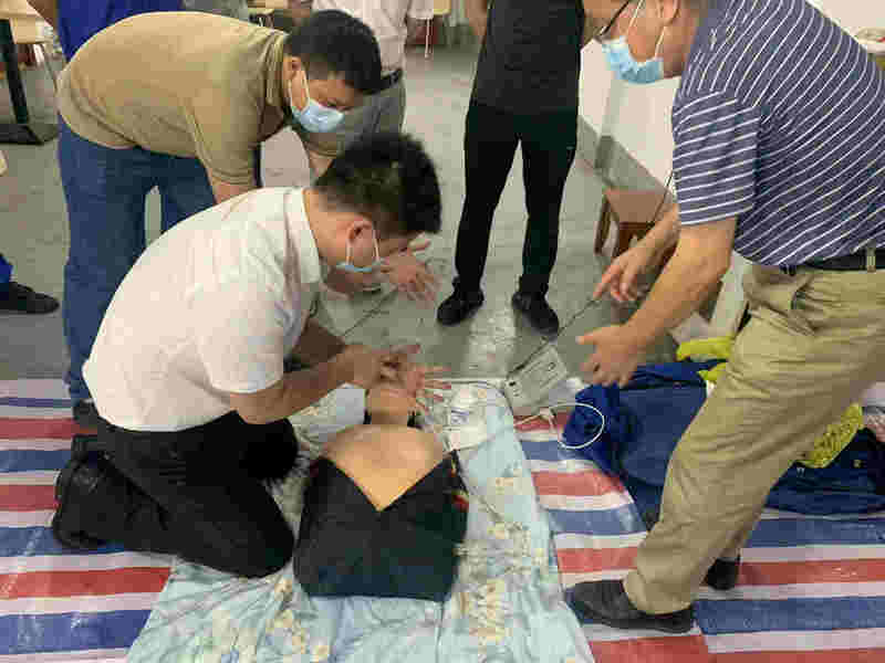 培訓特邀廣東省第二人民醫(yī)院專家到場授課,通過PPT演示,詳細講解了如何判斷被救者心跳呼吸停止、心肺復蘇指征、心肺復蘇操作步驟、復蘇成功指征等專業(yè)知識,并親自示范了從評估現(xiàn)場環(huán)境、判斷被救者狀態(tài)、清理口中異物及開展正確的按壓施救等各個環(huán)節(jié)。在專家演示完后,項目員工、業(yè)主及監(jiān)理人員也借助模擬人等教具進行實操,學習了急救手法,同時專家也及時糾正了大家的錯誤與不足。經過了兩個多小時的現(xiàn)場演練互動,逐步掌握自救和互救技能,具備了一定的應對心臟驟停的處理能力。