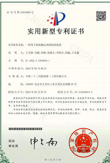 除此之外,由該項(xiàng)目原經(jīng)理,現(xiàn)任中鐵二十三局集團(tuán)二公司黨委書記、執(zhí)行董事劉德與現(xiàn)任項(xiàng)目經(jīng)理王寶財(cái)、總工程師王大勇等研制的用于陡坡搬運(yùn)混凝土預(yù)制塊裝置以及用于提高鋼筋籠箍筋施工效率裝置的兩項(xiàng)工法也先后獲得國家專利。
