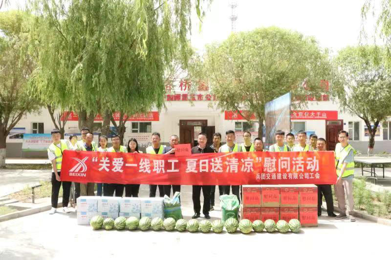 圖木舒克訊(通訊員 皇甫秉淑)近日,圖木舒克高溫炎熱天氣持續(xù),烈日炙烤著一線施工人員,也牽動(dòng)著公司領(lǐng)導(dǎo)的心。6月13日上午,公司黨委副書記、總經(jīng)理趙睿龍赴新疆北新路橋集團(tuán)圖木舒克子公司所屬項(xiàng)目開展“關(guān)愛一線職工 夏日送清涼”慰問活動(dòng),去施工現(xiàn)場看望慰問一線職工,將防暑降溫藥品、西瓜、礦泉水、綠豆等送到職工手中。
