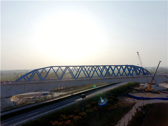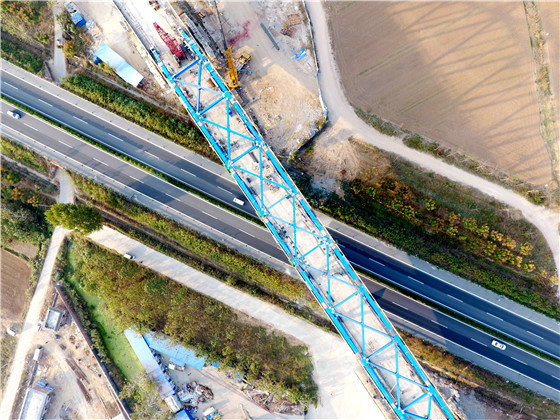 當(dāng)天,在鄭阜鐵路跨寧洛高速連續(xù)梁鋼桁梁拼裝施工現(xiàn)場,遠(yuǎn)遠(yuǎn)就能看見一排高聳田間的高架橋,早已成為沃野間一道壯麗風(fēng)景線。眺望大橋,宛如一條藍(lán)色巨龍,橫貫G36寧洛高速,為豫東門戶再添新的靚麗風(fēng)景,橋下依然滿是川流不息的來往車輛,看似“親密”但又互不影響。
