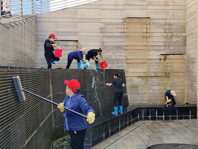 為不影響到大廈的美觀、整潔和舒適感。大家不畏艱辛,不厭其煩的一點一點在烈日下大清洗。經(jīng)多人合作,長達幾個小時的高溫天氣下清掏沖洗,水池也漸漸變得煥然一新。噴泉也逐漸回復(fù)了往日的正常運轉(zhuǎn)。