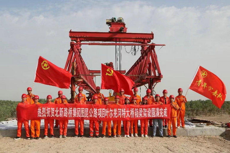 據(jù)該項目經(jīng)理董軍介紹,葉爾羌河特大橋是實現(xiàn)圖昆公路全線貫通的重要結(jié)構(gòu)物,也全線是開工最晚、工期最緊張的一個標段,面對國慶節(jié)通車總目標,項目部按照目標不變、任務不減、質(zhì)量不降,全力以赴挖潛力、搶進度,合理編排施工組織,優(yōu)化設(shè)計方案,克服風沙、酷暑等重重困難,根據(jù)特大橋工程量大、周期長等特點,合理安排了橋梁運輸、橋面作業(yè)等交叉工序,定人定崗把控工程安全質(zhì)量關(guān),開展節(jié)點考核,積極落實安全質(zhì)量、施工進度獎勵措施,充分調(diào)動了全體參建人員工作熱情和積極性,為整體施工進展贏得了寶貴時間。在300多名參建者共同努力下,圖昆二標項目橋梁下部結(jié)構(gòu)、箱梁預制及箱梁架設(shè)各節(jié)點全部超前完成施工任務,跑出了品質(zhì)工程建設(shè)“北新速度”。