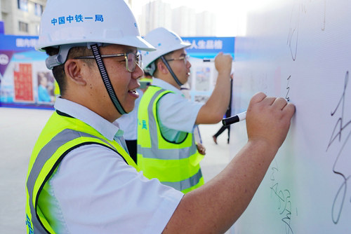 職工代表在活動展板上簽名承諾