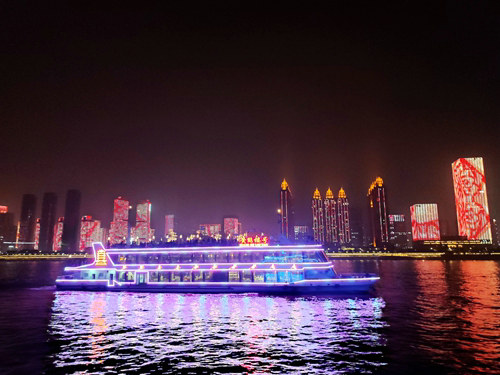 晚餐后,戰(zhàn)友們興致勃勃的來(lái)到了長(zhǎng)江2號(hào)碼頭,乘船游覽了兩江。武漢兩江夜游從武昌紅巷碼頭出發(fā),途經(jīng)黃鶴樓、長(zhǎng)江大橋、武昌造船廠(chǎng)、世貿(mào)錦繡長(zhǎng)江、龜山電視塔、晴川閣、晴川橋、中國(guó)角(南岸嘴)、龍王廟、武漢關(guān)鐘樓、106西安艦、303潛水艇、武漢客運(yùn)港、漢口江灘、粵漢碼頭、武昌江灘、武昌紅巷碼頭,有“工行牡丹”號(hào)、“東湖”號(hào)、“古琴臺(tái)”號(hào)、“江城”號(hào)等不同船只,隨機(jī)安排,每班航行1小時(shí)。
