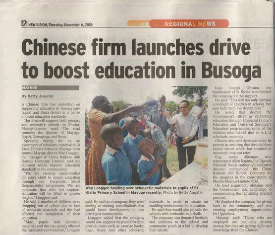 中國鐵路工程建設(shè)網(wǎng)天津訊(孫太東 劉士敏 報道)近日,烏干達最大報社《NEW VISION》新聞報道了十八局馬達加斯加公司烏干達項目部向當?shù)匾患倚W捐贈學習用品的愛心活動。標題的新聞是《中國公司在布索加發(fā)起了促進教育的運動》,報道詳細地介紹了十八局烏干達項目部捐贈情況,并配發(fā)了活動照片。十八局主動融入當?shù)厣鐣?,積極履行社會責任,與當?shù)毓蚕砗献靼l(fā)展成果,贏得了當?shù)卣腿嗣竦膹V泛贊譽。