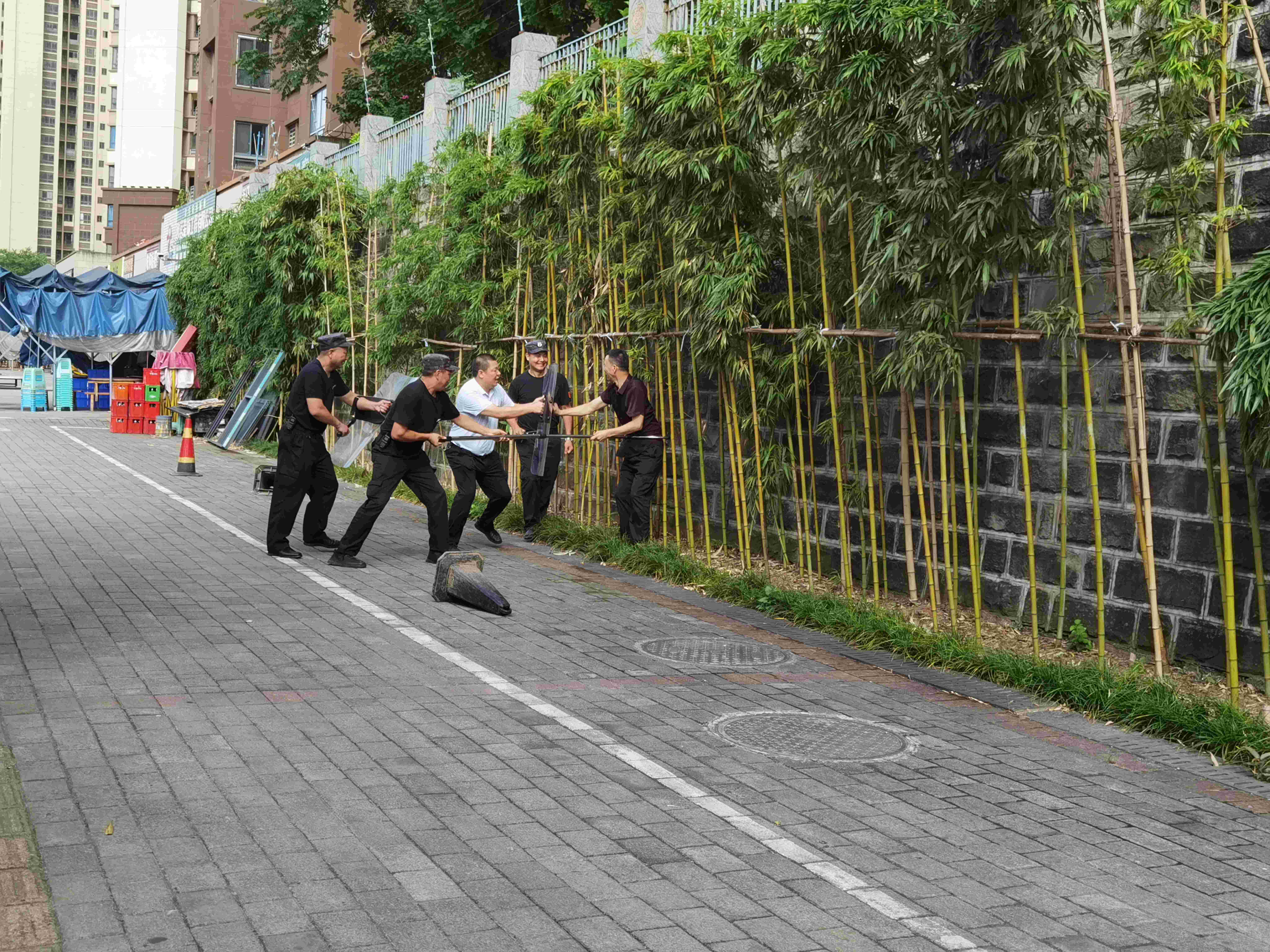 物業(yè)工作人員身著整齊制服,手持專業(yè)治安裝備,嚴(yán)陣以待。演練中,物業(yè)人員對占道經(jīng)營攤販進(jìn)行勸阻時發(fā)生爭執(zhí)并引發(fā)沖突斗毆。見狀,他們立即上前制止,迅速將攤販攔截控制,成功解除危機。此外,在基本醫(yī)療保障方面,物業(yè)人員也展現(xiàn)出專業(yè)應(yīng)急處置能力,手法堪比醫(yī)護(hù)人員。