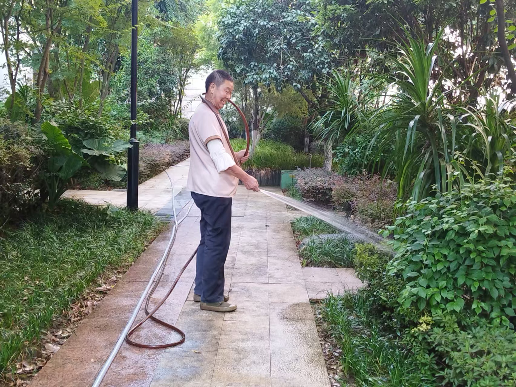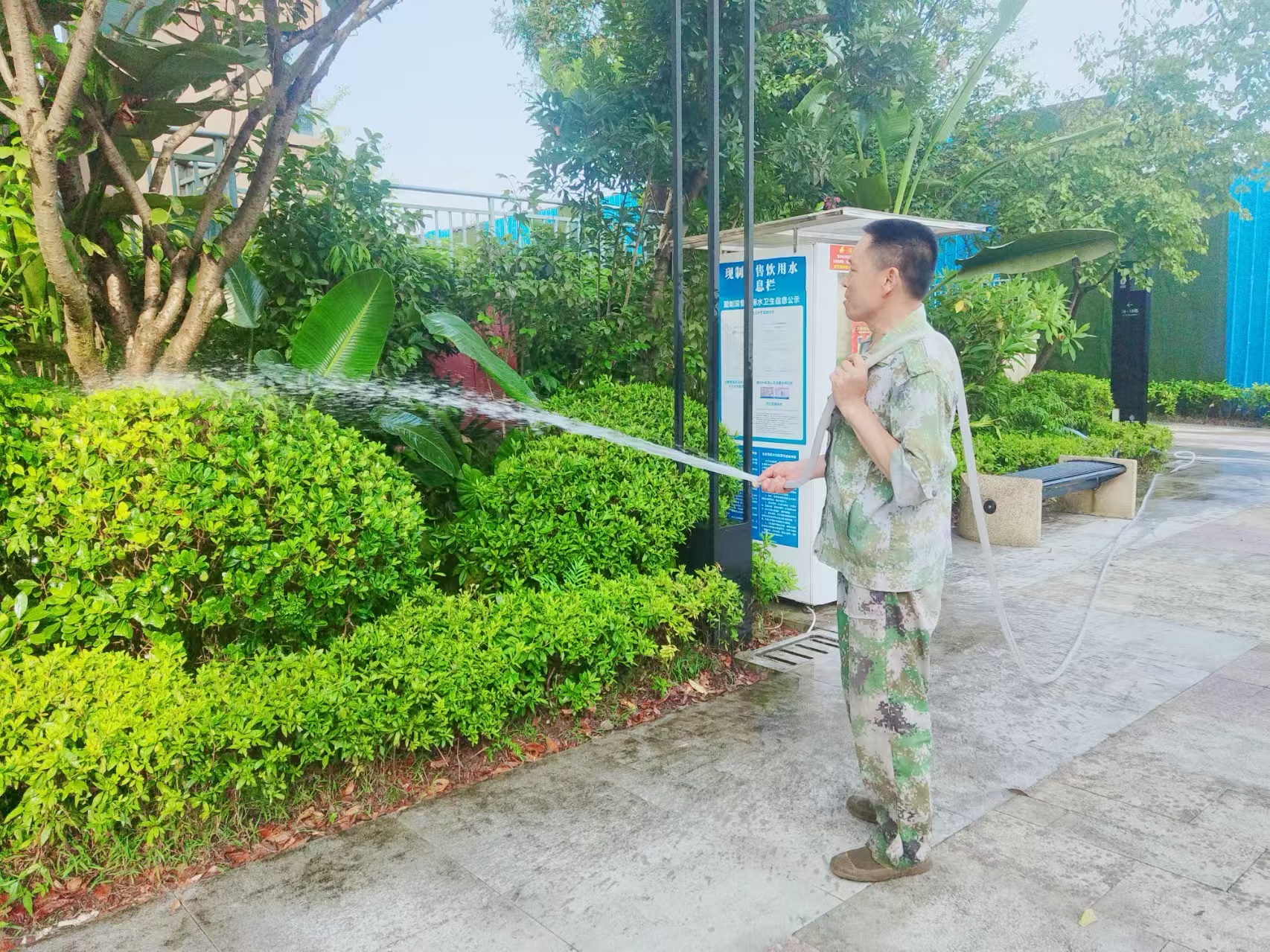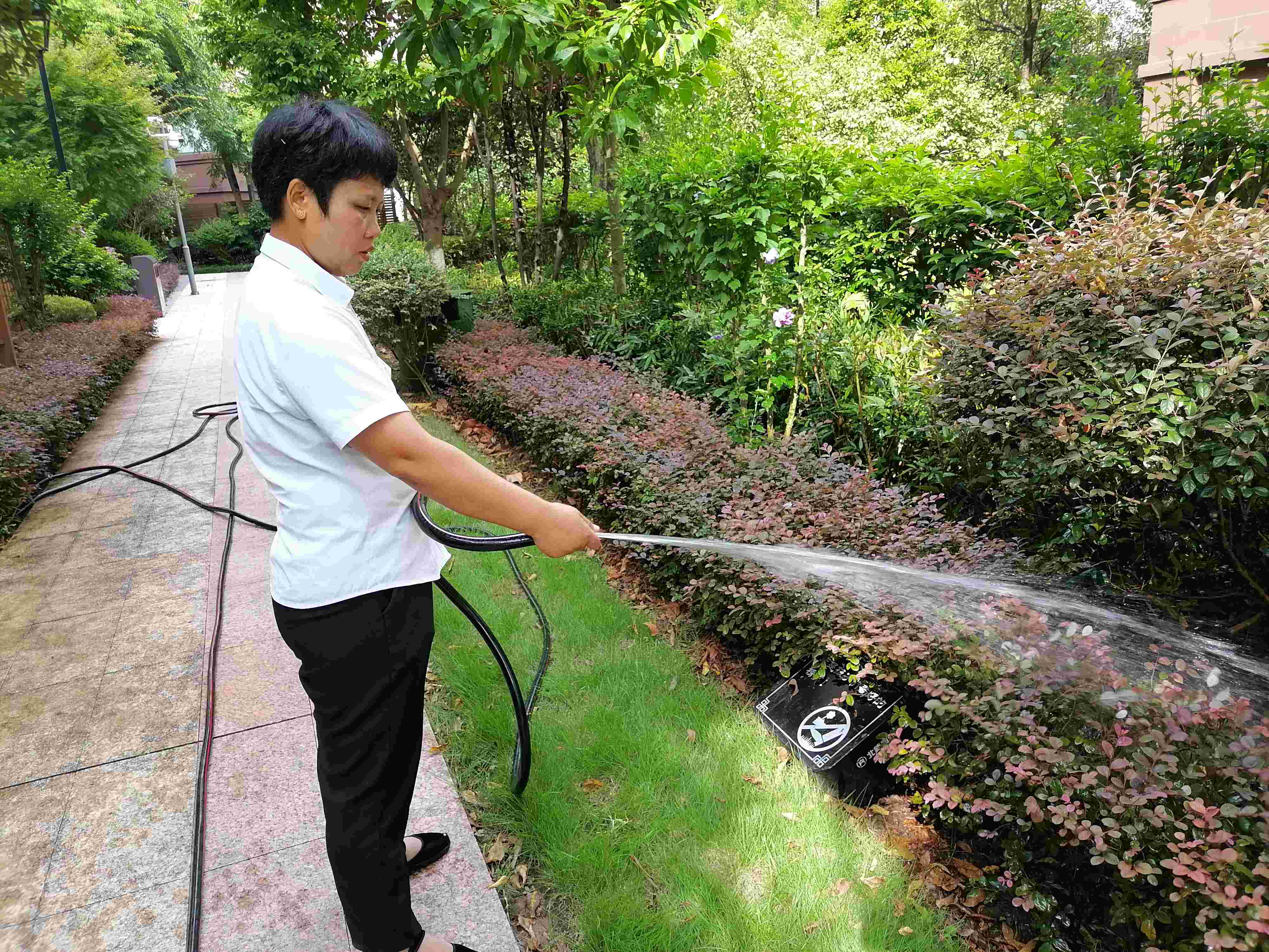 高溫仍在持續(xù),抗旱還需進行,烈日下,綠化養(yǎng)護員工黝黑的皮膚與小區(qū)的綠意盎然形成鮮明的對比,他們用自己的汗水,換來小區(qū)綠樹成蔭、賞心悅目。