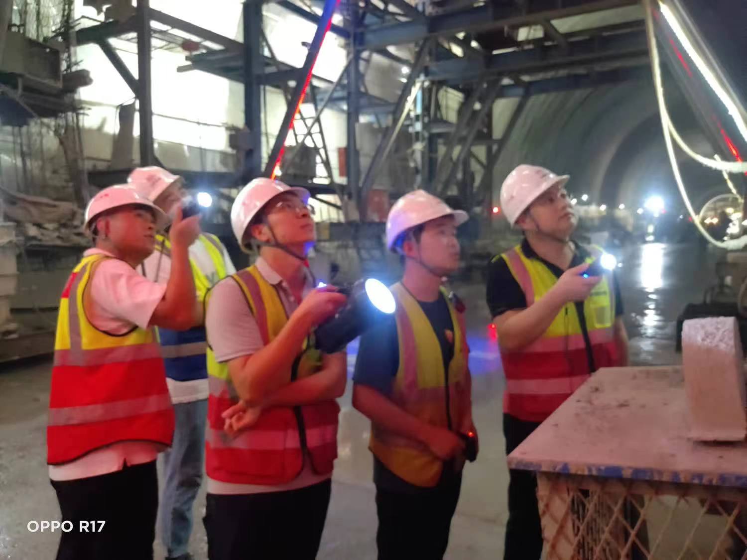 項(xiàng)目黨支部書(shū)記韓崇生(右一)組織黨員干部安全質(zhì)量先鋒崗在中梁山隧道進(jìn)口“夜查”