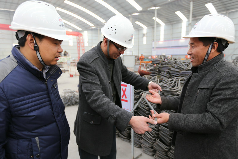 馬小利向項(xiàng)目經(jīng)理、項(xiàng)目總工介紹“8”字筋加工情況