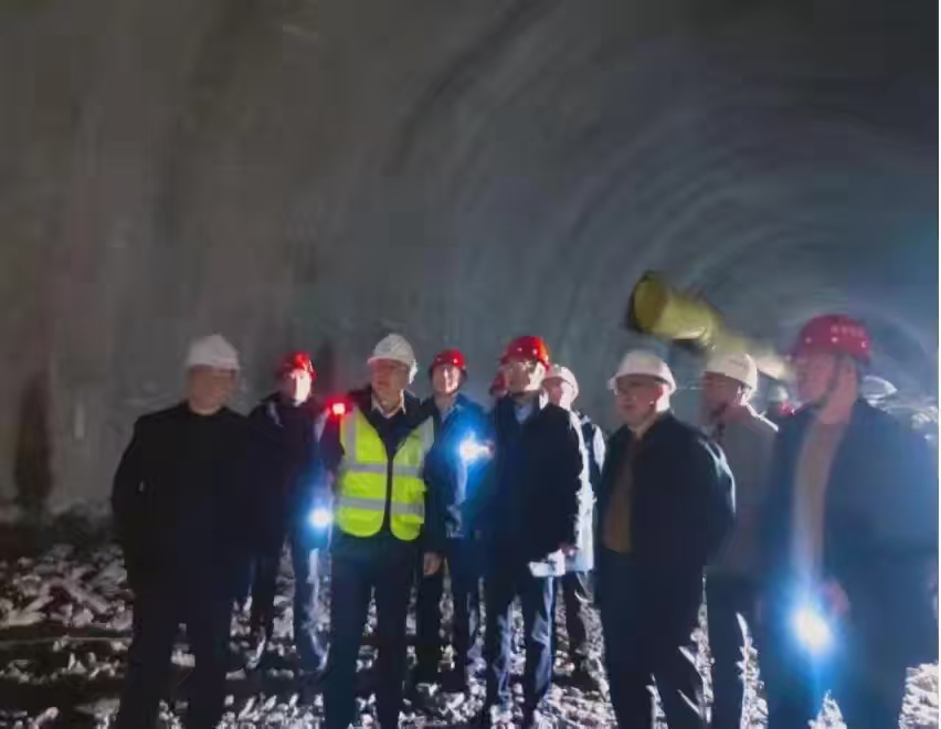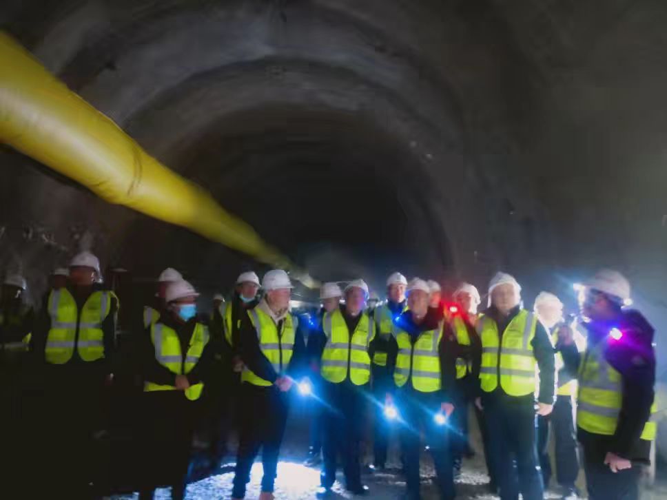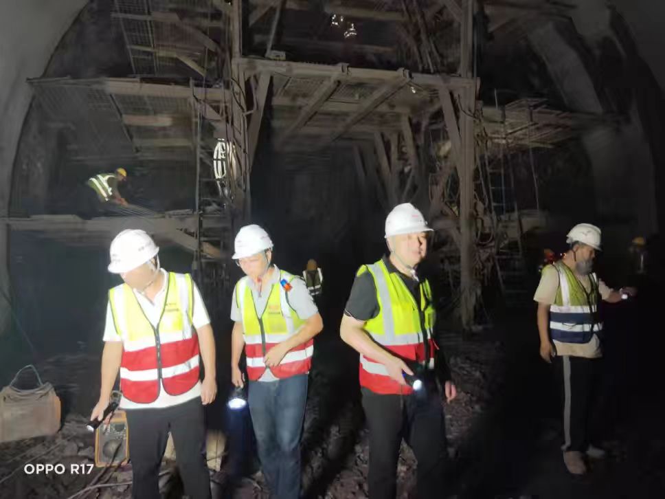 總承包部指揮長李兵(前排右二)、項目部經(jīng)理阮超(前排左二)在中梁山隧道進口掌子面檢查指導