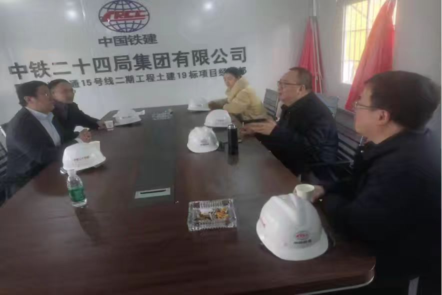 總承包部指揮長李兵(右2)與分管軌道工程項目領(lǐng)導(dǎo)徐新明(左1)、項目經(jīng)理王磊(左2)