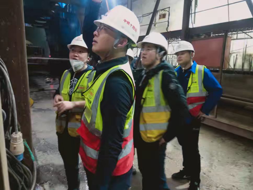 項(xiàng)目部安全總監(jiān)高超德(右2)陪同項(xiàng)目經(jīng)理阮超(右3)書(shū)記韓崇生(右1)中梁山隧道進(jìn)口進(jìn)行安全檢查