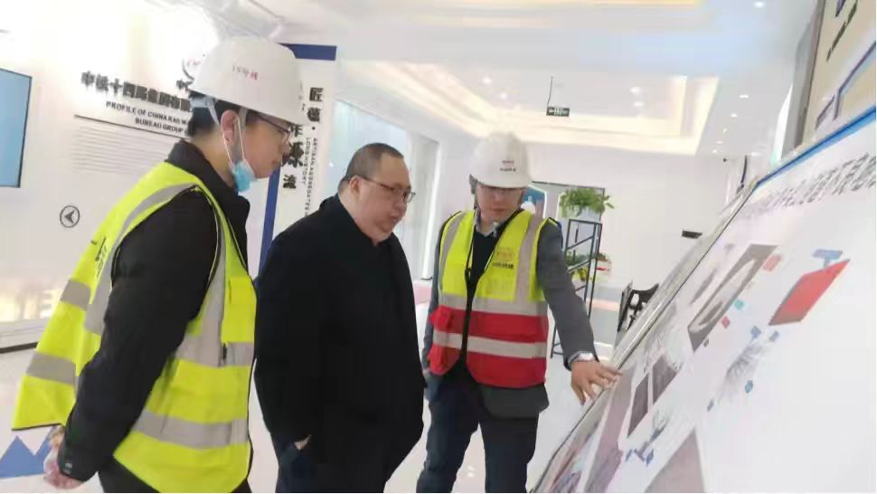 項(xiàng)目部經(jīng)理阮超(右)總工李文慶(左)向總承包部指揮長(zhǎng)李兵(中)匯報(bào)中梁山隧道質(zhì)量和安全受控情況