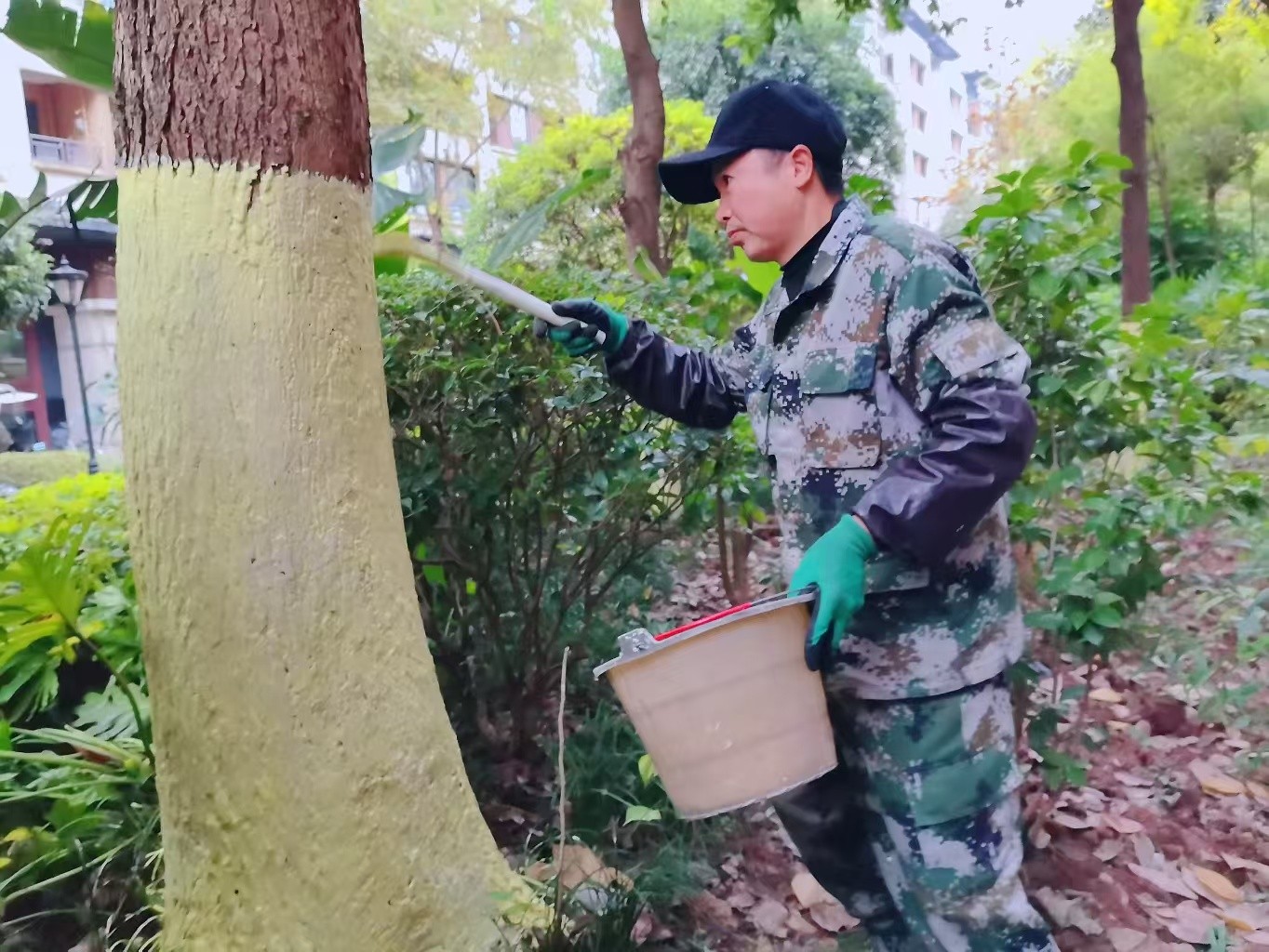 重慶合川訊(通訊員 湯英勇)隨著氣溫的逐漸下降,園林植物開始進(jìn)入冬季生長休眠期,為強(qiáng)化綠化植物養(yǎng)護(hù)管理,全力確保綠化植物安全越冬,近日,冬季樹木刷白防護(hù)工作全面啟動。宜邦物業(yè)園林工作搶抓天氣晴好的有利時機(jī),對御龍灣小區(qū)內(nèi)所有的樹木進(jìn)行涂白防護(hù)。