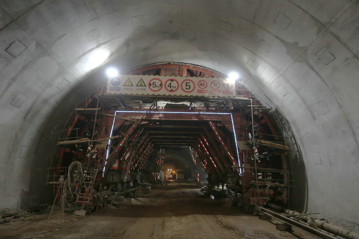 隧道二襯施工從岔口特大橋工地往山上眺望,“楊道塬隧道由中鐵二十一局三公司承建”兩排紅底白字的巨幅廣告牌,在藍(lán)天白云映襯下格外醒目,為深山里的黃土塬增添了一抹亮色。沿著陡峭的盤山便道蜿蜒上行,就是楊道塬隧道出口。洞口正在澆筑仰拱,進(jìn)入洞內(nèi),已二襯的隧道拱頂和邊墻泛著清水混凝土本色,無錯臺和蜂窩麻面,外觀質(zhì)量好。隧道掌子面上,幾名身穿紅黃反光背心的工人在上道坑梯子上,用鐵锨鏟起拱線和拱頂?shù)狞S土。隧道施工隊負(fù)責(zé)人說:“左洞已掘進(jìn)180米,右洞120米,施工進(jìn)展順利,保證按期貫通沒有問題。”