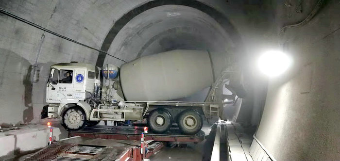在隧道內(nèi)調(diào)頭,對(duì)于大型重載卡車十分困難,直接影響到出碴、澆筑無砟軌道等施工進(jìn)度。由中鐵二十一局三公司承建的重載運(yùn)煤專線蒙華鐵路小南塬隧道全長7067.2米,其寬度比一般高鐵、高速公路隧道窄一兩米以上,重型卡車在洞內(nèi)調(diào)頭十分困難。尤其是在無砟軌道施工中,除去隧道兩邊已澆筑排水溝、電纜槽,其地面空間只剩7米,而大型砼罐車長達(dá)9.1米,只有開著進(jìn)去、倒著出來。