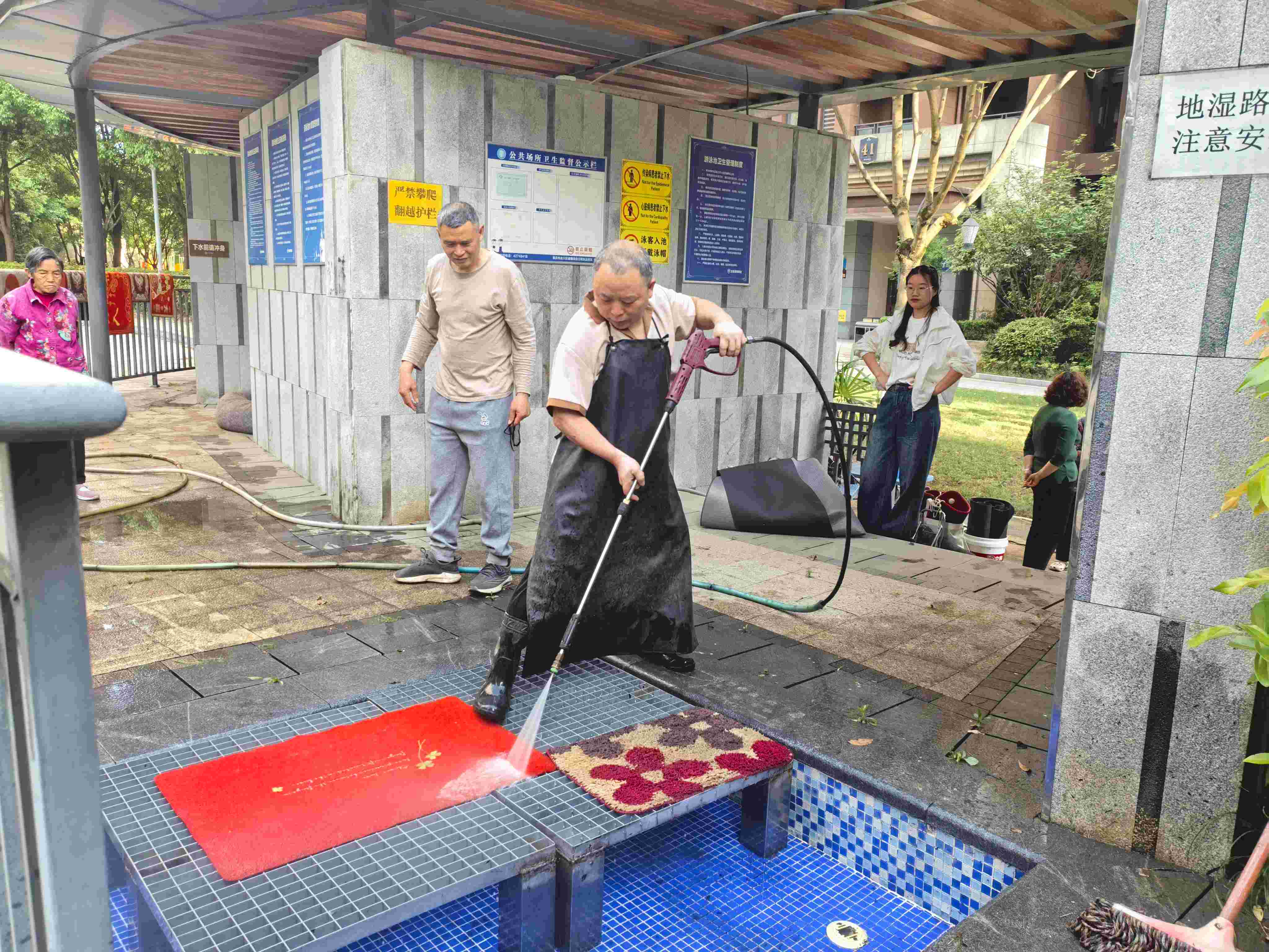 活動當天,物業(yè)工作人員早早布置好沖洗區(qū)域,配備高壓水槍、刷子、清潔劑等工具,有序為業(yè)主提供地墊深度清潔服務。從除塵去污到?jīng)_洗晾曬,工作人員細致周到的服務讓不少業(yè)主感嘆:“平時地墊厚重難清洗,物業(yè)這次真是想到我們心坎里了!”活動現(xiàn)場還設置了便民休息區(qū),進一步拉近了與業(yè)主的距離。