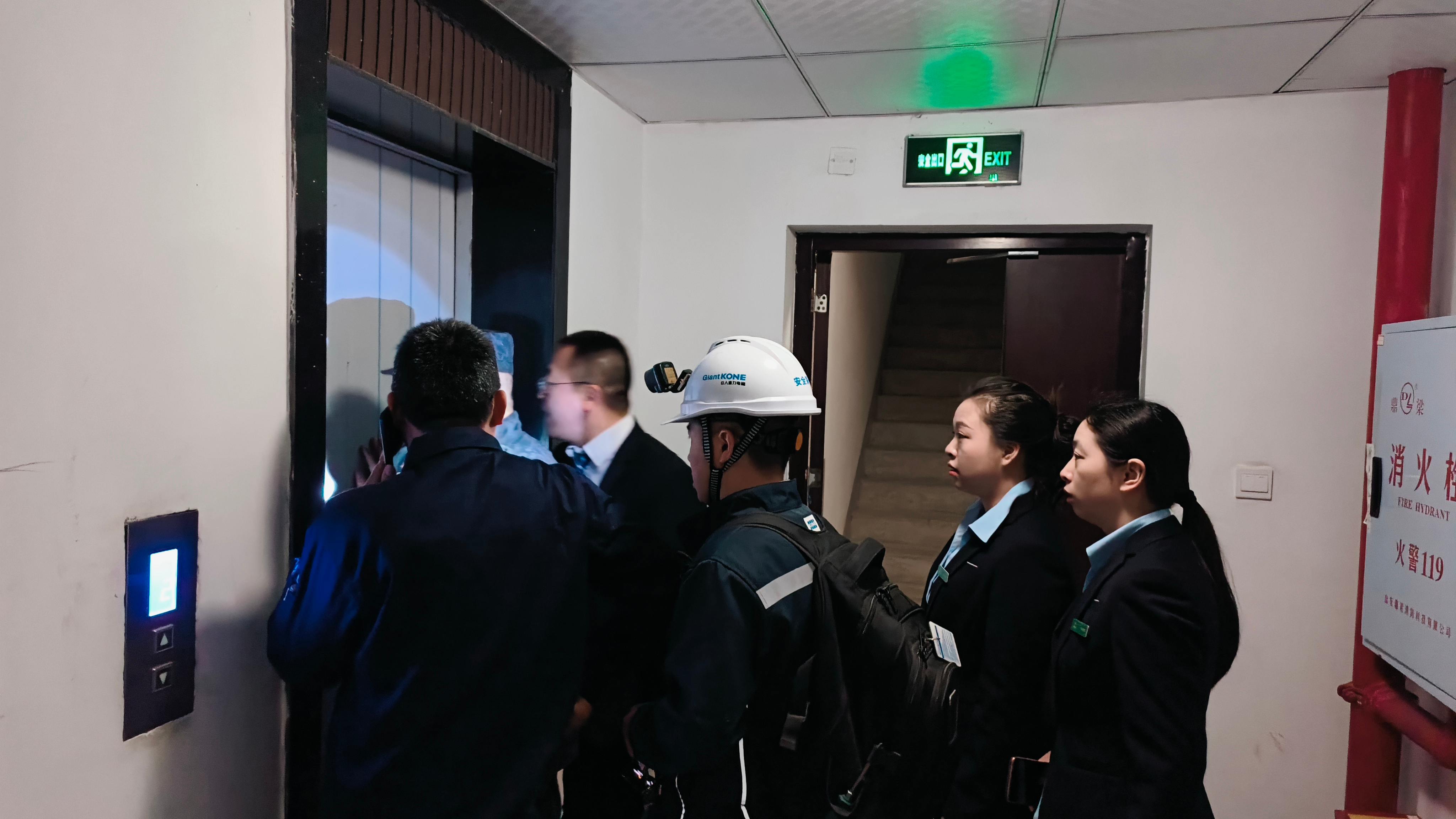 上午9點,演練人員準時在二街區(qū)物業(yè)服務中心,總指揮陳連進行演練前的重要事項講解及部署,伴隨著演練正式開始,物業(yè)消防控制室接到救援通知,緊急上報當班領導并按照救援預案啟動演練;安撫組進行現(xiàn)場安撫,緩解被困人員情緒,并告知正確避險方式;救援組進行施救,維保技術人員嚴格按照救援操作規(guī)程,在機房進行斷電、松閘、盤車等一系列專業(yè)操作,將轎廂緩慢移動至平層位置;醫(yī)療組在被困樓層待命,隨時處理突發(fā)狀況;在被困人員解救出去后維保單位對電梯進行全面檢查,找出電梯困人原因并對其進行分析和解決,確保電梯后續(xù)正常運行。