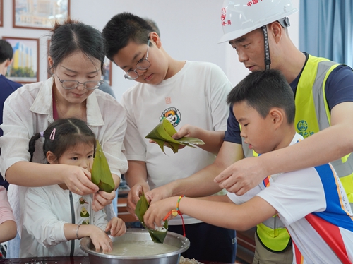 在包粽子環(huán)節(jié)中,項目部為孩子們現(xiàn)場準(zhǔn)備了粽葉、糯米、紅棗、豆沙等多種食材,家長與孩子默契配合開始包粽子,捋粽葉、填餡料、扎棉線,一個個飽含愛意的粽子很快成型。孩子們捧著自己的勞動成果,成就感滿滿。