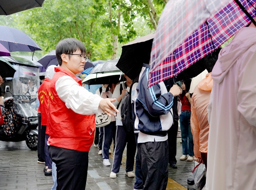 7日清晨,因雨水天氣,在社區(qū)的統一安排下,志愿者們迅速在學校門口搭建了應急愛心助力志愿服務點,為考生和等待的家長們提供遮風擋雨的地方,同時為考試和家長提供礦泉水、應急文具、休息板凳等。待考生進入考場后,志愿者主動邀請家長進入帳篷下避雨,與家長們聊及高考注意事項,緩解家長的焦慮心情。過程中,志愿者們積極協助太乙路辦事處維持考場外紀律秩序,文明引導行人和車輛停放秩序,全力保障考點周邊環(huán)境??荚嚱Y束,志愿者們?yōu)槲磾y帶手機的考生提供電話服務,幫助及時聯系家長,節(jié)約考生時間,做好充足午休,為下一場考試做好充分準備。青年志愿者們高度的責任感和熱情的服務態(tài)度,成為西安市鐵一中考場外一道亮麗的風景線。