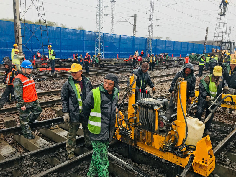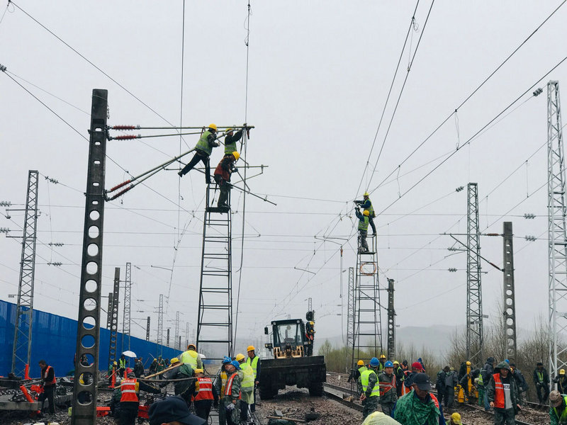 既有線施工保安全,點(diǎn)內(nèi)施工保正點(diǎn)。岢嵐,昨天21:25時(shí)起,下著大雨。4:50時(shí),大家冒著大雨向封鎖施工現(xiàn)場(chǎng)集結(jié)。5:16時(shí),施工現(xiàn)場(chǎng)290余名參戰(zhàn)人員精神抖擻,嚴(yán)陣以待。7;06時(shí),項(xiàng)目再一次現(xiàn)場(chǎng)全員點(diǎn)名,進(jìn)一步明確目標(biāo)任務(wù),Ⅲ級(jí)要點(diǎn)施工大會(huì)戰(zhàn)即將打響。8:00時(shí),封鎖命令下達(dá)。參戰(zhàn)的各施工作業(yè)隊(duì)人員和機(jī)具快速就位,迅速撲向撥接線路,進(jìn)入既定崗位。8:01時(shí),現(xiàn)場(chǎng)安全防護(hù)、巡查、盯控人員聚精會(huì)神地觀察、確認(rèn)每一個(gè)作業(yè)環(huán)節(jié)。8:02時(shí),各施工隊(duì)嚴(yán)格按照預(yù)定方案進(jìn)行,施工作業(yè)人員兵分九路,防護(hù)、吊裝、拆除、插岔、撥道、搗固、換裝、調(diào)整、試驗(yàn)同時(shí)交叉作業(yè),嚴(yán)格按照預(yù)定方案進(jìn)行。8:06時(shí),寧岢鐵路安塘“一站一線”和線路撥接點(diǎn)機(jī)具轟鳴,掀起了集中會(huì)戰(zhàn)的施工熱潮。8:15時(shí),扒道砟聲、切割軌道聲、抬鋼軌的號(hào)子聲、機(jī)器轟鳴聲此起彼伏。8:56時(shí),新10號(hào)道岔順利插入。10:45時(shí),道岔新線與既有線實(shí)現(xiàn)聯(lián)結(jié)。11:06時(shí),信號(hào)新微機(jī)聯(lián)鎖、通信、信號(hào)、接觸網(wǎng)開(kāi)通啟用。11:25時(shí),根據(jù)“工完料凈,人走場(chǎng)清”要求。施工完畢后,項(xiàng)目安全防護(hù)員對(duì)現(xiàn)場(chǎng)內(nèi)外進(jìn)行仔細(xì)檢查確認(rèn),對(duì)施工廢棄物、遺留工具或垃圾及時(shí)清理干凈。11:38時(shí),施工人員全部安全撤出現(xiàn)場(chǎng),為本次“天窗”施工畫上圓滿的句號(hào)。12:00時(shí),安塘站調(diào)度室下達(dá)施工結(jié)束令,封鎖施工順利完成,安全正點(diǎn)實(shí)現(xiàn)了線路開(kāi)通。