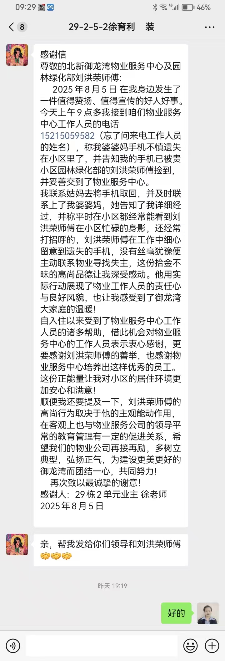 物業(yè)服務(wù)中心項目二部主管接到手機后,通過手機內(nèi)的 “敬老卡” 信息,迅速鎖定失主為三街區(qū) 29-2-5-2 的徐育利,并及時聯(lián)系其前來領(lǐng)取。當(dāng)徐育利得知撿到手機的是平日工作認真負責(zé)、待人熱情的劉洪榮師傅時,難掩激動之情:“劉師傅平時修剪園林就一絲不茍,這次還主動歸還手機,太讓我感動了!” 當(dāng)晚,便寫下感謝信,為劉洪榮的善舉點贊,也向北新宜邦物業(yè)培養(yǎng)出這樣的優(yōu)秀員工致謝。?