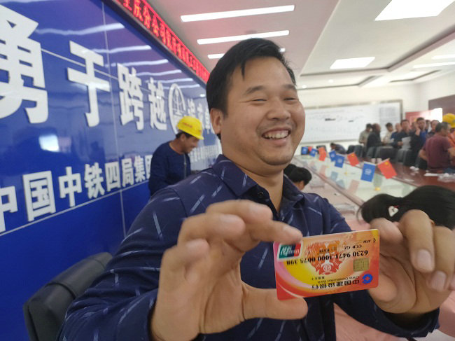 屋內(nèi)熱火朝天,一位剛激活工資卡的湖南小伙李中輝說道:“很開心,在很多工地工作過,這是第一次享受這個待遇,在工作人員的耐心指導(dǎo)下,我知道怎么使用網(wǎng)銀。”另一位重慶工友蔡光明也表示“很貼心,項目部工會能把銀行‘帶來工地’方便多了,有了這張卡片,進(jìn)賬出賬都有短信提醒,我感到很安心、放心。我在這個工地,更加有了擼起袖子加油干的決心和信心。”