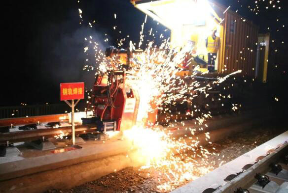 漢十高鐵使用的無砟軌道,每根軌道長500米,鋪在枕木上后,兩段接頭之間肯定會有細(xì)微的縫隙,這時(shí)需要焊接。中鐵十一局集團(tuán)采用了國內(nèi)最先進(jìn)的移動閃光焊技術(shù),讓兩節(jié)鋼軌消除最后的縫隙,完全“融合”在一起變成一根鋼軌。