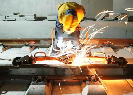 500米長鋼軌鋪設(shè)完成后,便開始鋼軌打磨、焊接、探傷等工序。