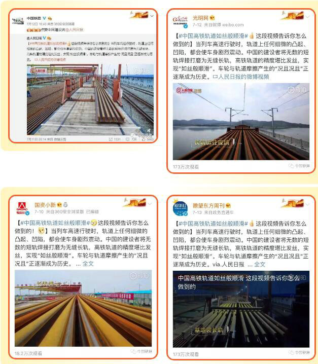 7月10日,中鐵十一局集團(tuán)攝制的《中國高鐵軌道如絲般順滑,這段視頻告訴你怎么做到的》視頻發(fā)布后,相繼在新浪微博中被人民日報(bào)、紫光閣、光明網(wǎng)、新華社瞭望東方周刊、國資小新、中國鐵路、人民鐵道等眾多網(wǎng)絡(luò)大V轉(zhuǎn)發(fā),在團(tuán)中央B站更是引來網(wǎng)友彈幕刷屏點(diǎn)贊。不到一周時(shí)間,該視頻閱讀量已突破1000萬,目前仍呈上升趨勢。