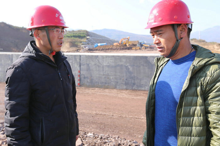 圖為張永(左)與路基隊(duì)隊(duì)長(zhǎng)王寧周(右)在研究路基填筑施工任勞任怨埋頭苦干做敬業(yè)的典范