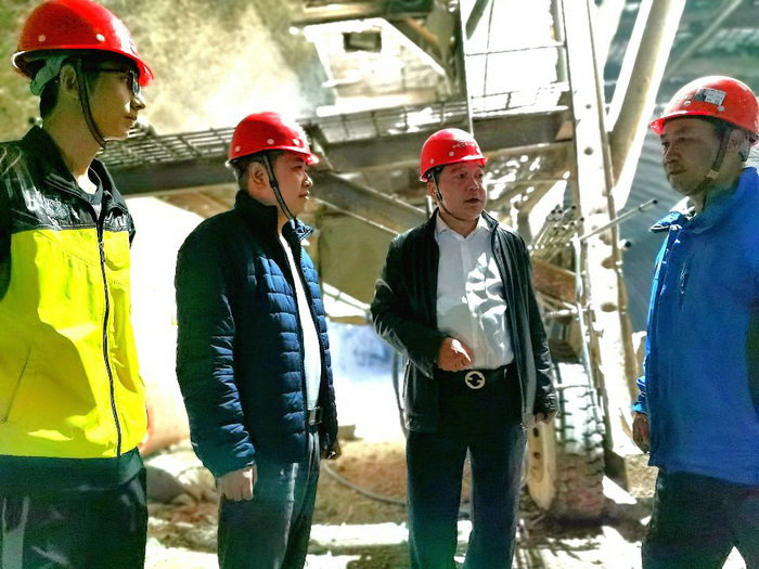 公司副總經(jīng)理兼項(xiàng)目經(jīng)理雷榮仁(右二)、安全總監(jiān)史玉龍(右一)、隧道一工區(qū)負(fù)責(zé)人汪衛(wèi)(左二)在隧道進(jìn)口掌子面