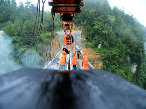 (譚帥)9月16日,山城重慶依舊籠罩在霧雨綿綿的空氣中。當(dāng)日16時(shí)45分,在黔江區(qū)石子壩鄉(xiāng)境內(nèi)的渝懷鐵路增建二線的架橋施工現(xiàn)場(chǎng),連續(xù)多日降雨所形成地縷縷“薄紗”裹挾了橙黃色的TJ165型架橋機(jī)。隨著工人們“一、二、三開始過梁” 的指令發(fā)出,上百噸重的T梁開始平穩(wěn)向前滑行。架橋機(jī)的上空,陰云密布,細(xì)雨如牛毛般悉數(shù)落下。