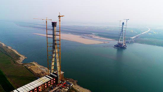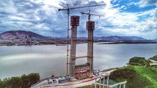 石首長江大橋全長2670米,為主跨820米的雙塔單側(cè)混合梁斜拉橋,主塔塔高232米,位列國內(nèi)斜拉橋前20?;炷亮簢鴥?nèi)首次采用預(yù)制提升滑移膠拼施工方法。項(xiàng)目成功解決了超高主塔快速施工及線形控制問題。大橋主塔已經(jīng)封頂,混凝土箱梁膠拼施工也將完工,大橋進(jìn)入鋼箱梁吊裝施工階段。